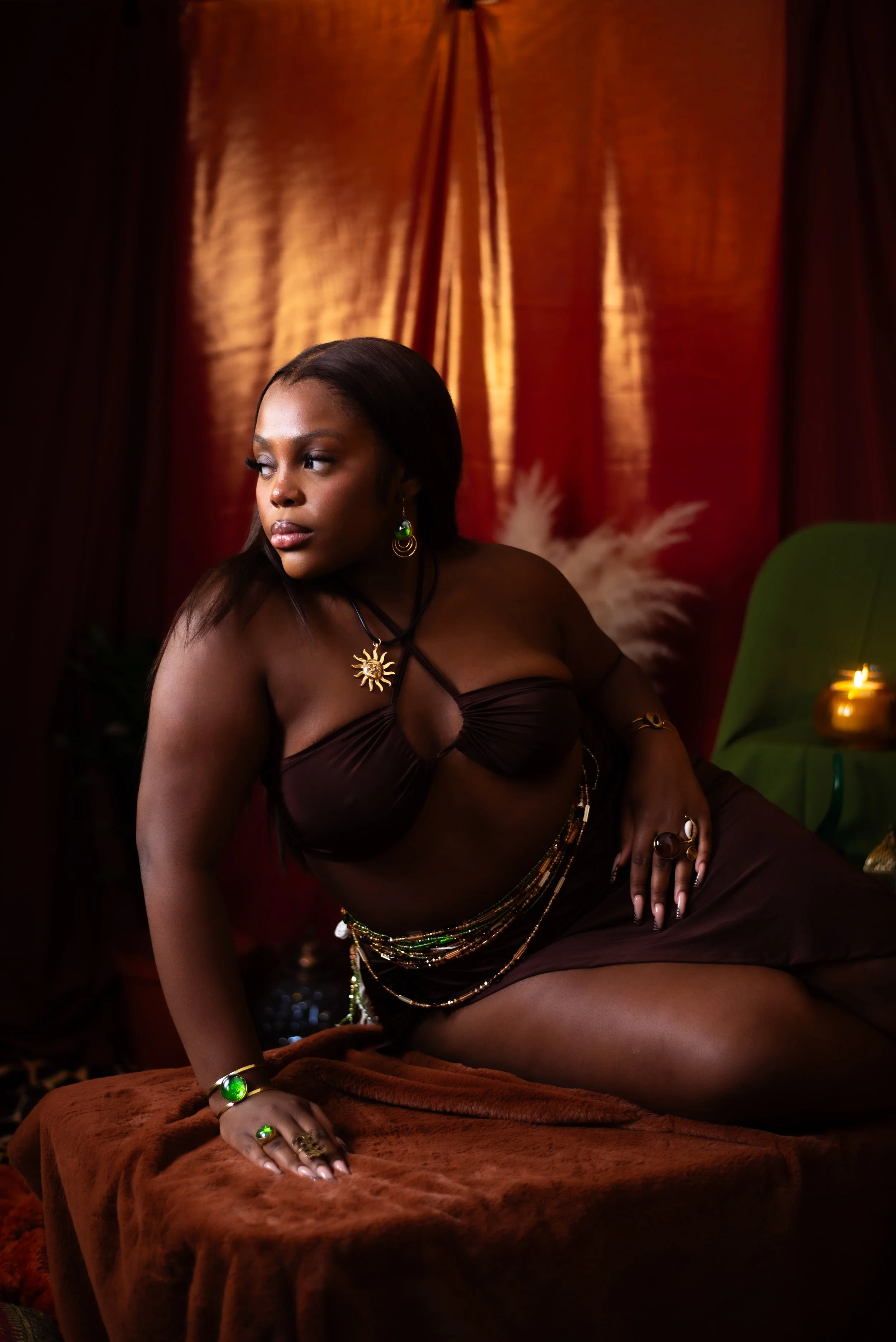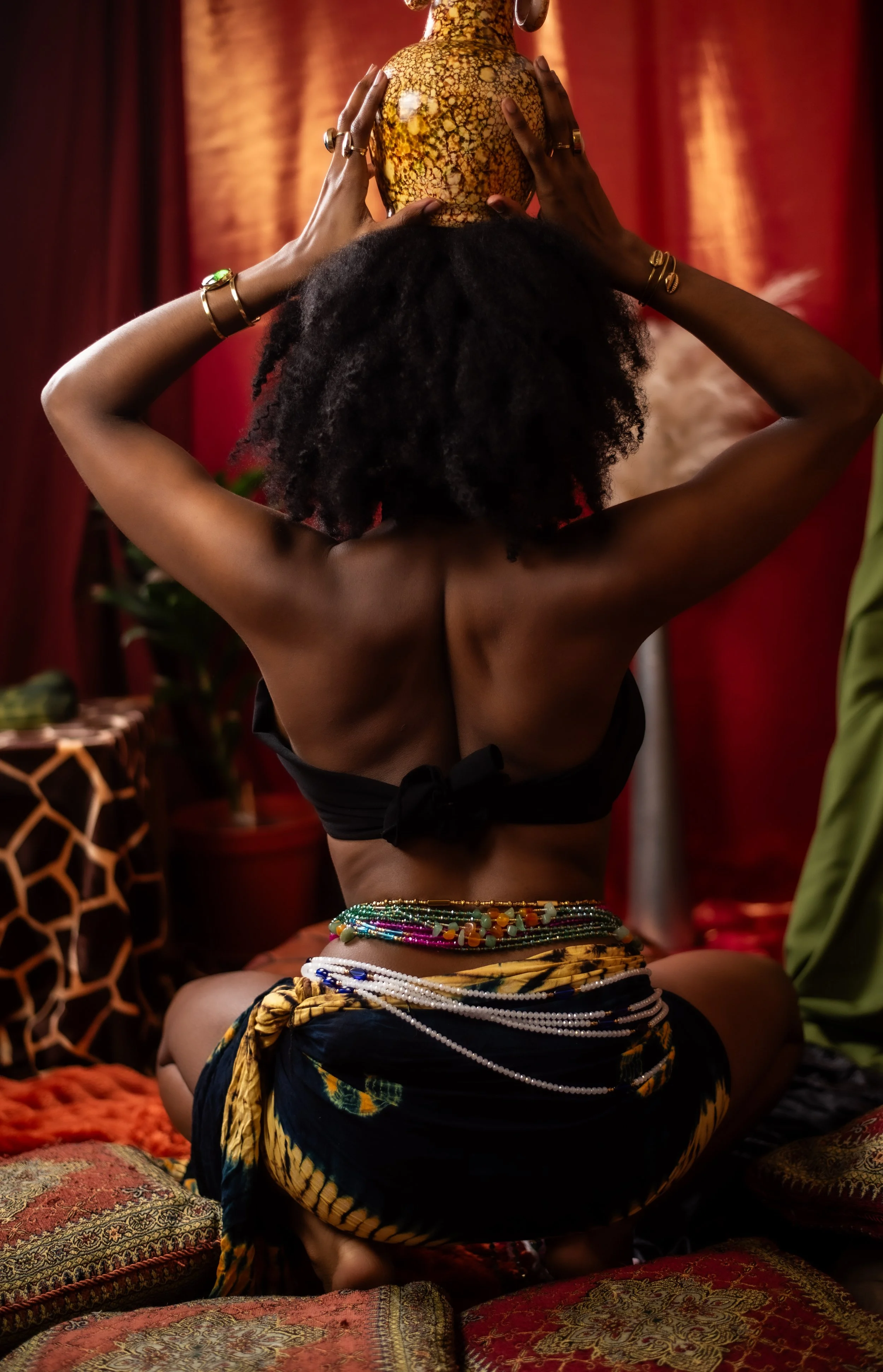 Our collections blend tradition with contemporary artistry, drawing inspiration from ancestral aesthetics, natural materials, and the expressive rhythms of everyday life. Many of our pieces incorporate brass sourced from Kenya, waist beads crafted with intention, and designs that pay homage to body adornment practices rooted in history and identity.